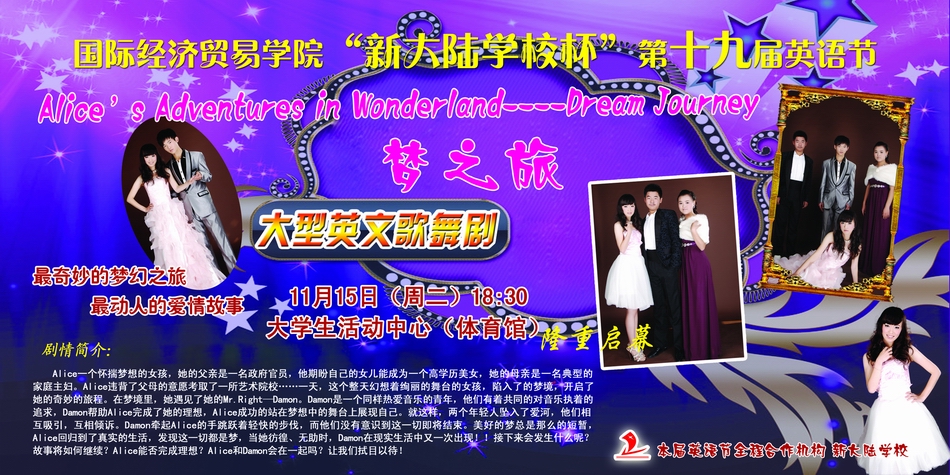 2011年11月15日(周二)18:30 校活动中心大型英文歌舞剧《梦之旅》华丽启幕...