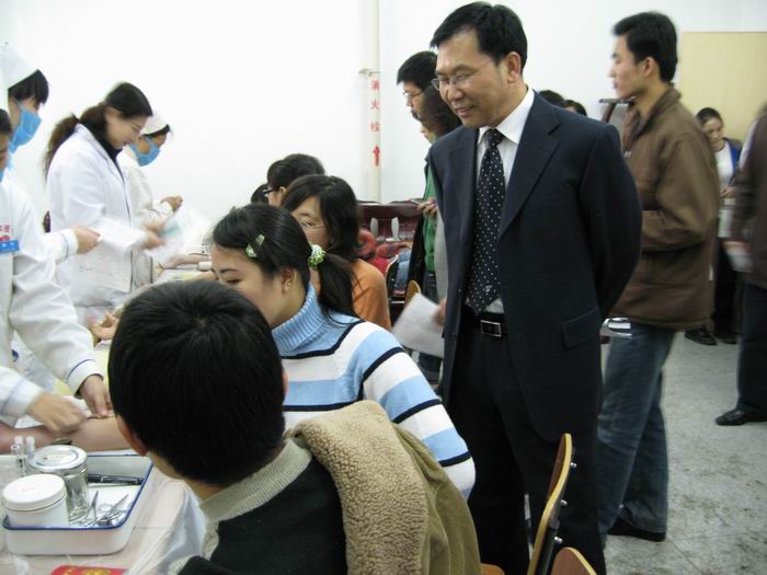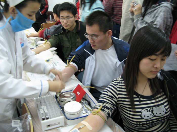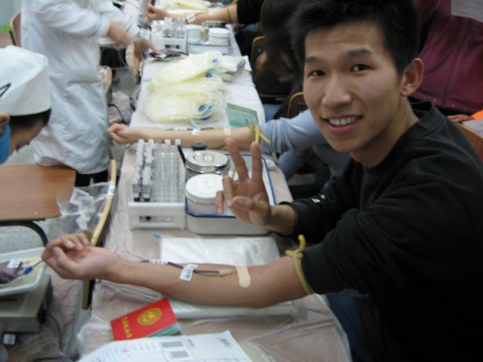 我系有近四十名同学参加了义务献血。在现场,献血同学秩序井然,极力配合工作人员各项工作。通过填表、登记、测量血压、化验血液等一系列严格而必要工作后,身体素质合格的同学开始进行献血。在采血屋内,献血同学面带微笑,象一个个充满爱心的勇士,尽自己的一分力来帮助那些与病魔斗争的人。虽然有些同学因为某些身体原因不能参加献血,但他们的精神是值得我们学习的。采血期间院领导慰问了正在进行献血的同学,并表示鼓励与赞赏。活动结束后,我系分团委细心地为献血同学准备了补充营养的食品,同学心中一片暖意。除此以外,主办单位也对本次活动中我校同学的积极支持表示非常感谢,并为献血同学准备了免费人身保险和小礼品作为鼓励。