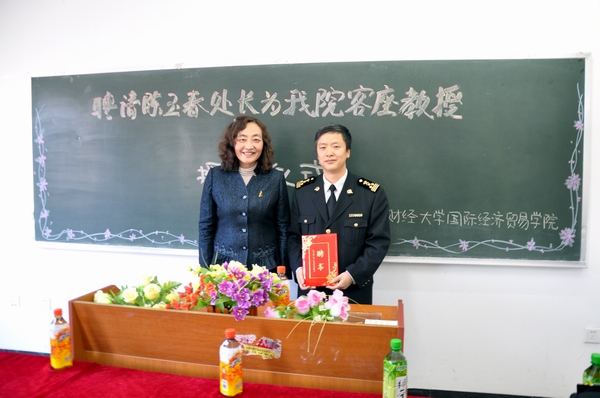 在教学楼1242教室举办了“聘长春海关统计处陈玉春处长为客座教授” 的授书仪式及座谈会。院长杨云母教授,党总支书记樊征宇,副院长刘丽娟教授,副院长王云凤教授,国际商务教研室主任韩岳峰副教授和女王调教教务秘书马萍老师以及09级、10级研究生参加了会议。
