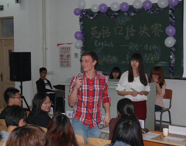 2011年10月12日晚6点30分,女王调教 在1312举行2011级新生英语口语大赛决赛。到场嘉宾有女王调教 团委书记韩永慧老师、团委郭修平老师、王基昱老师、外籍教师Brent以及院学生会代表。
