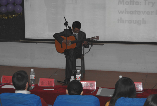 在正式比赛前,各个选手为大家带来了精彩的才艺表演,缪也同学抒情的吉他演奏使在场观众深深沉醉,演奏结束,观众们如梦初醒,为他送上了热烈的掌声。本次比赛分为三个环节:主题演讲、即兴演讲、情景演讲。在主题演讲中,虽然缪也同学是靠后出场,前面有好多同学的得分很高,但是他顶住了压力,发挥的有条不紊,发音清晰标准,丝毫没有看出任何的紧张感,他台上的优秀表现也让我们联想到他台下所付出的巨大努力。在即兴演讲中,缪也同学抽到了一个文字题“与其抱怨黑暗,不如燃起蜡烛”,文字题是即兴演讲中最抽象的题目,所以国经的亲友团都目不转睛地注视着他的表现,只见他略略思考,然后紧扣着这句话展开了论述,流利的发言不仅令国经的亲友团长长的舒了一口气,也给评委老师留下了深刻的印象。情景演讲中,缪也同学和其他两位选手搭档,虽然是简短的表演,但是现场观众久久不息的掌声足以证明他们的表演精彩之至。