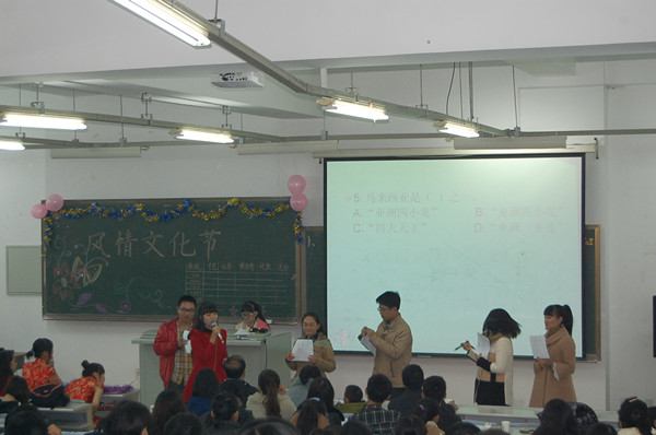 本届风情文化节分为才艺展示,必答题,模仿秀和风险题四个环节。在才艺展示环节中,我们欣赏到了由大一新生精心准备的节目,有好听的日本动漫歌曲,动感的韩国舞蹈,俄语歌曲《星星》, 精彩的泰拳表演以及马来西亚风情的舞蹈,这些精彩的节目让我们充分领略到了各国的风土人情。在必答题环节中,同学们机智聪慧的完成了作答,表现出大家丰富的课外文化知识和对生活积极的态度。接下的游戏环节中,同学们齐心协力为班级争取分数,使全场的气氛达到高潮。学生会主席团的几位学长学姐也积极的参与到了游戏当中,同大一新生一起完成了游戏。在超级模仿秀环节中,同学们精彩搞笑的配音模仿引发观众们阵阵笑声。在最后一个风险题环节中,同学们在紧张刺激的氛围下完成了作答。随着获奖班级的公布,活动也在同学们的欢声笑语中结束了。