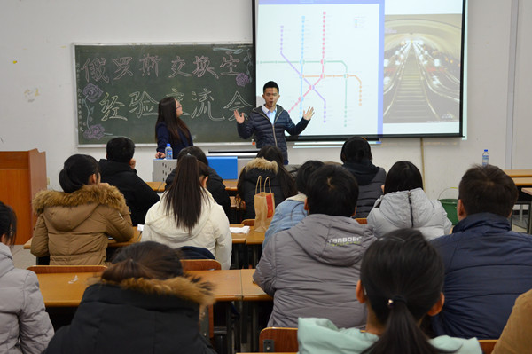 从俄罗斯圣彼得堡经济大学留学归来的陈奇聪、姜志超同学首先向大家展示了俄罗斯优美的风景图片。一幅幅异域风情的照片令大家心生向往。随后,他们围绕出国前需要准备的问题进行了耐心细致的解答。而后对于同学们关心的俄语学习方面,也细心地进行了指导。大家畅所欲言。姜志超同学指出:学习俄语语言首先要打好基础,用读写结合的方法加强对知识的记忆。同时也要为自己营造良好的语言环境,多听俄语音乐,多看俄语电影,只有这样,才能更快地接受知识,让学习俄语不成为负担。