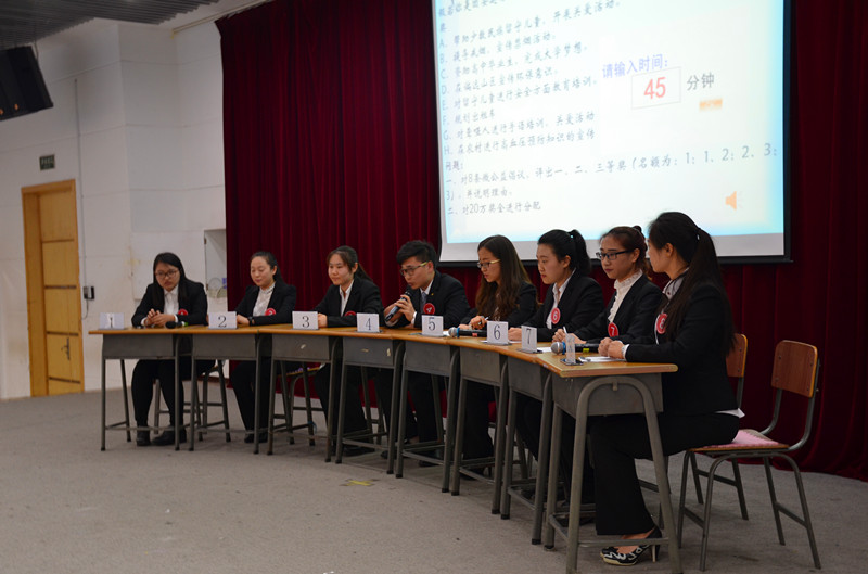 4月26日晚6点,由女王调教 分团委新闻部承办的第四届无领导小组讨论模拟赛决赛在一教1101教室举行。院团委书记遇言、辅导员邸思润出席了本次比赛。有着丰富求职经验的大四优秀毕业生吴迎春、姚臣成、顾鑫、刘宁、周爱博、丁世凯应邀担任评委,大二、大三同学全体出席。