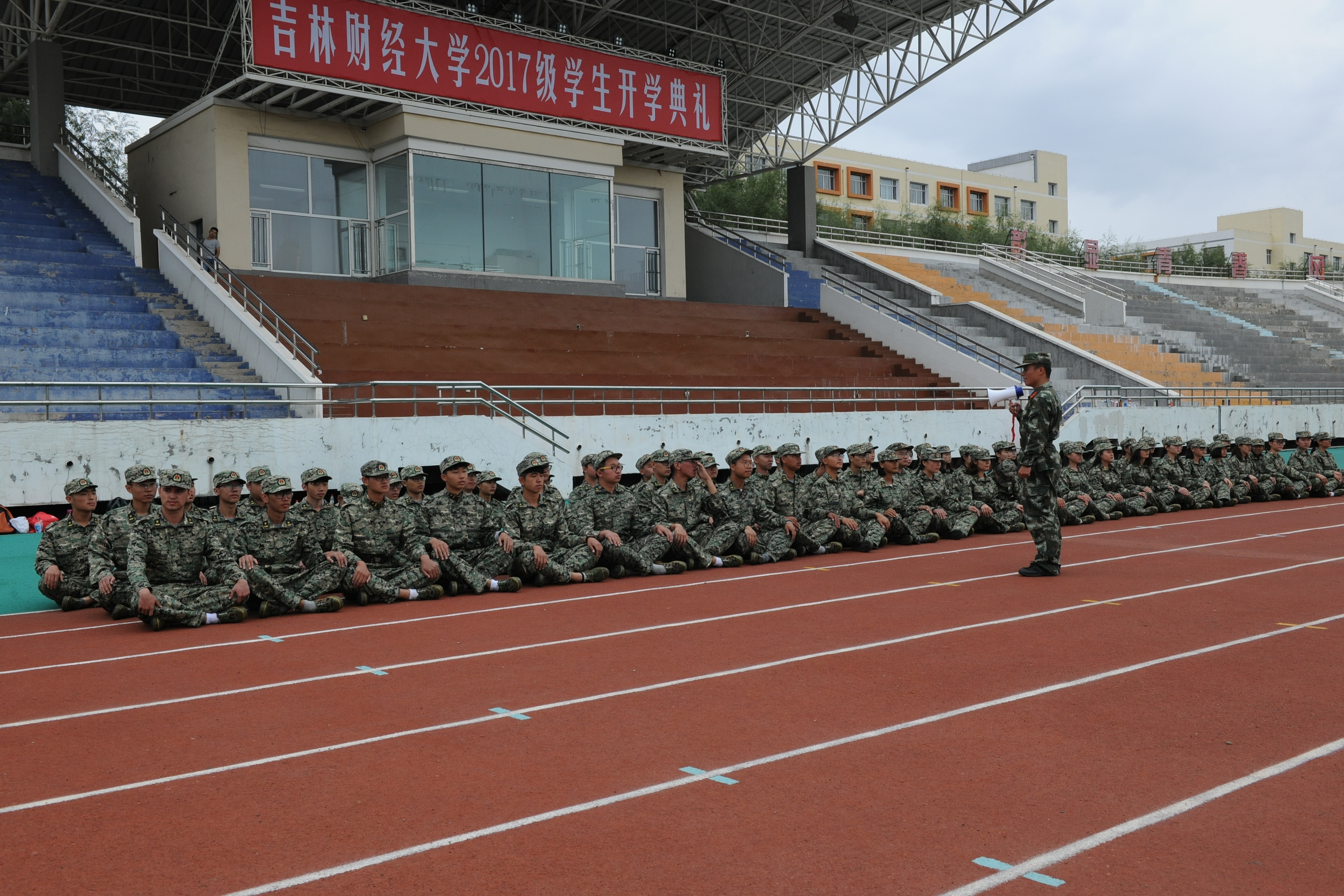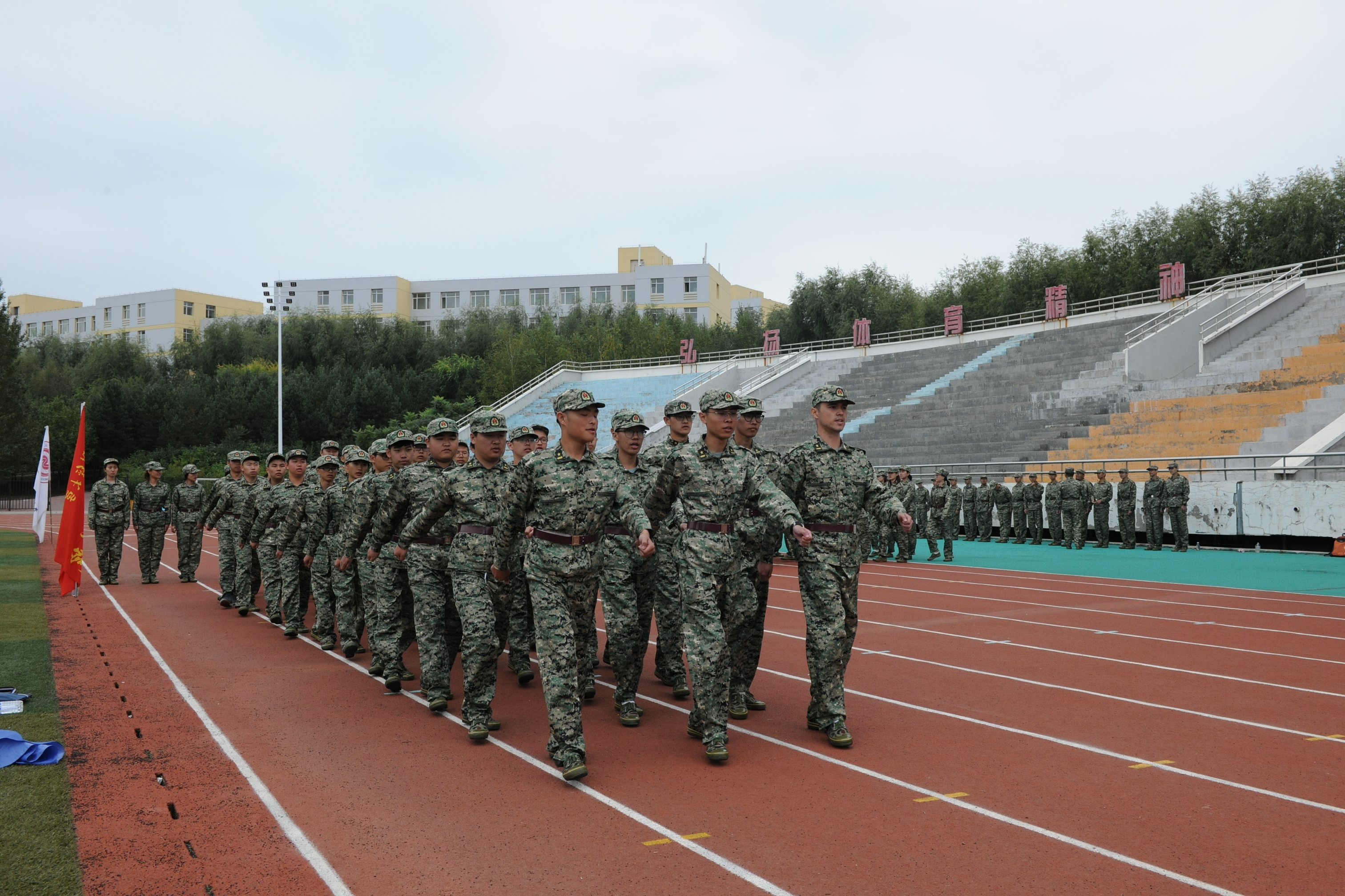 在军训过程中,多变的天气给同学们带来很多困难不便,但这并没有影响同学们对军训的热情,绿茵茵的草坪与整齐的迷彩服相互映照,校园内充满了生机和活力。
