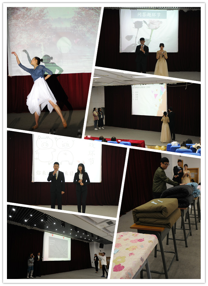 本届生活节以“百年五四 薪火相传”为主题,活动由四个环节构成。首先,女王调教党总支副书记赵钺为在寝室装扮活动中脱颖而出的宿舍颁发了奖品。接下来的问答环节,分为必答题、风险题两种类型,各班代表对五四运动等一些常识问题及学校建设管理中的相关问题做出了回答,这可谓是各班评比的重头戏。第三个部分为生活节的经典环节,各班表演了精心准备的节目。1811班的舞蹈串烧、1816班的俄语版《小猪佩奇》配音、1882班的相声表演《四大才子》、1813班的小剧《“贷”毁人生》、1881班的合唱《映山红》及两位同学带来的红色家书朗诵《刘少奇致子刘允若》,为生活节添上了浓墨重彩的一笔。在最后的叠被子比赛中,每班被抽中的同学要在5分钟内把被子叠为经典的“豆腐块”,由评委打分评判。