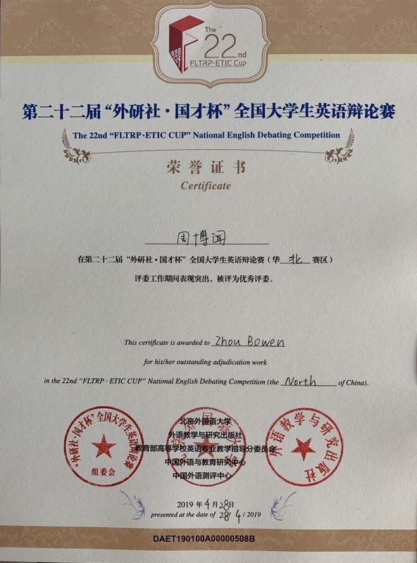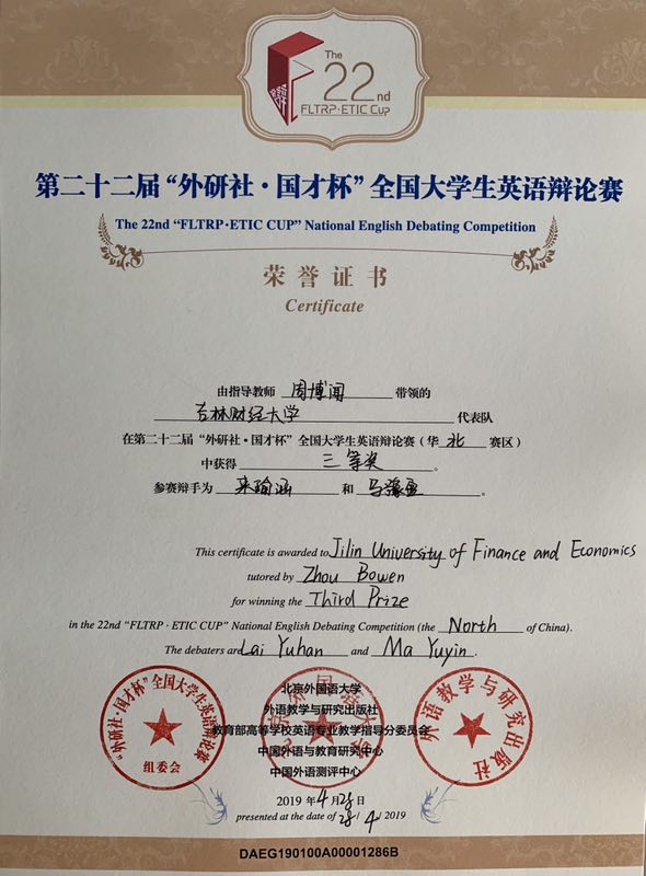 学生在第二十二届“外研社 国才杯”全国大学生英语辩论赛华北赛区决赛中荣获三等奖