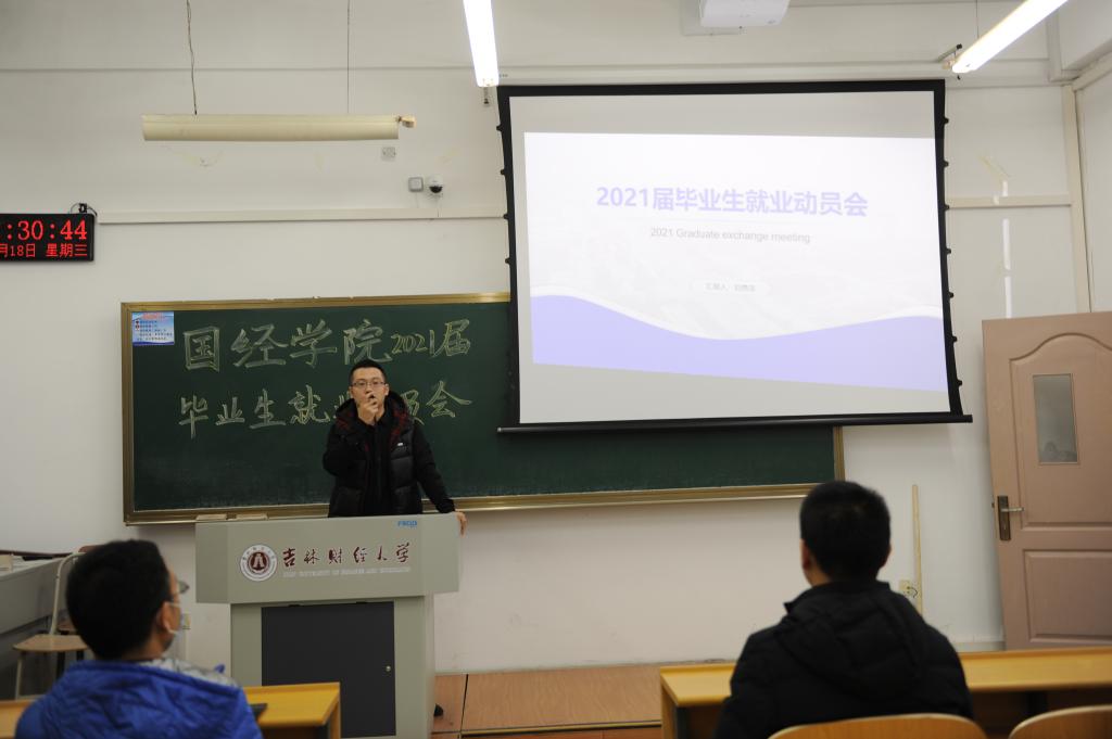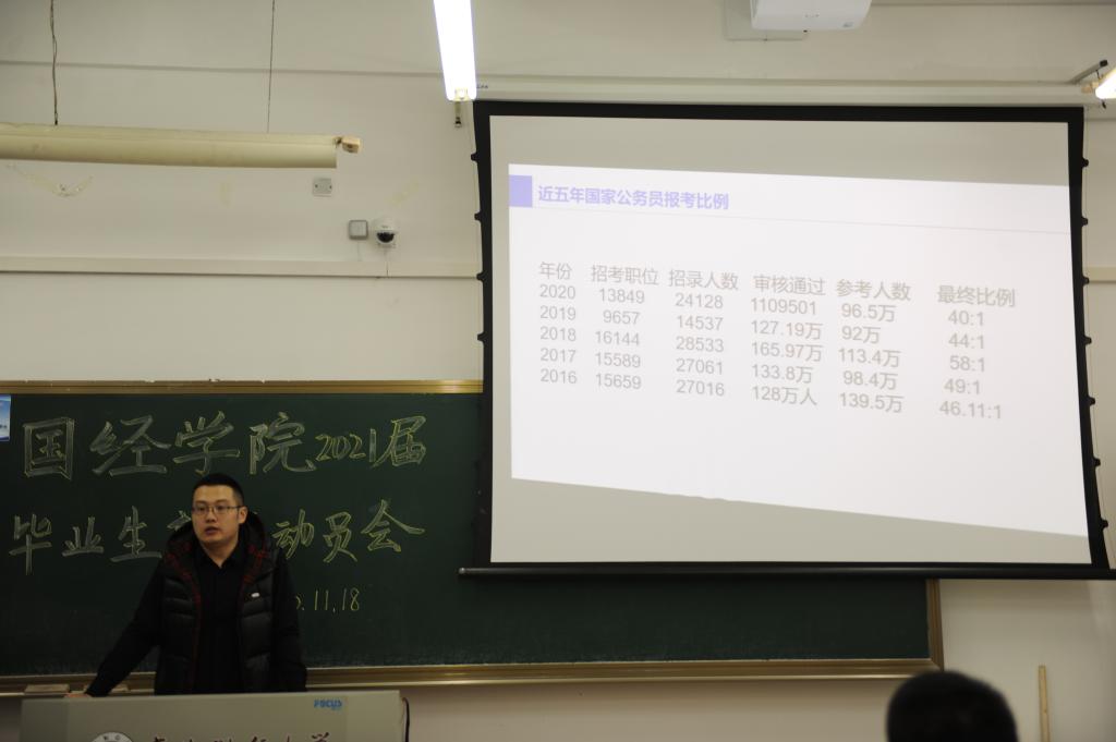 动员会中,刘恩泽老师首先介绍和分析了女王调教 2021届毕业生的就业和考研形势。刘老师分别针对考研、公务员、事业单位、校企合作、二学位和出国留学这六种毕业选择向毕业生们提出了建议并给予了相关指导。随着考研学生比例的逐年上升,叠加二战、三战考研群体,虽然2021年研究生将继续扩招,但计划增量主要投向了临床医学、公共卫生、集成电路、人工智能等专业,财经类毕业生考研形势依然严峻,考研压力依然很大。刘恩泽老师在向准备考研的同学们表达祝福的同时,也建议同学多角度做好毕业选择,鼓励本届毕业生抓住各种机会,通过校招等各种招聘平台在毕业季找到自己理想的工作。