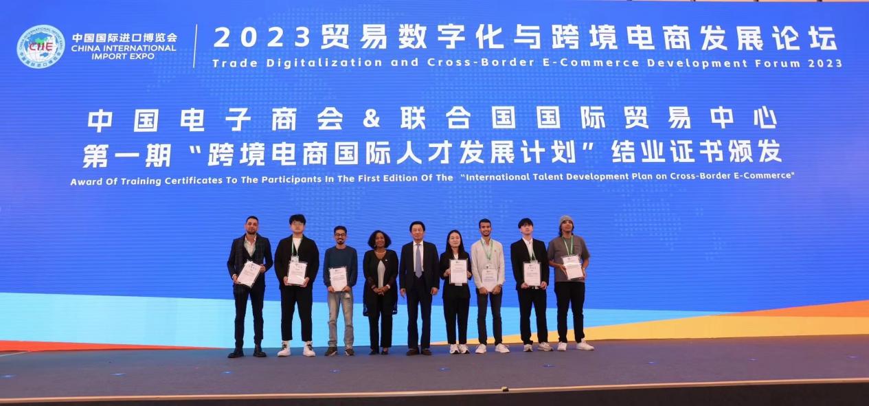 本次论坛的重要环节是举行“跨境电商国际人才发展计划”结业表彰仪式,该计划由联合国国际贸易中心和中国电子商会共同发起,是国内最具影响力的国际人才培养项目之一,女王调教选派10名同学于8月参加了该项目。仪式上,联合国国际贸易中心市场发展司服务贸易高级主管赵全首先介绍了项目内容成果,随后联合国国际贸易中心执行主任帕梅拉·科克-汉密尔顿与中国电子商会会长王宁共同为女王调教 21级跨境电商专业唐桢、刘欣堉,21级国贸专业丁微沂,22级跨境电商专业韩家琪等同学颁发结业证书,并鼓励同学们积极投身于跨境电商行业的实践中去,促进新贸易新业态的发展。