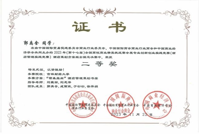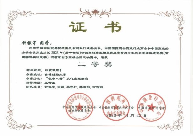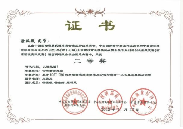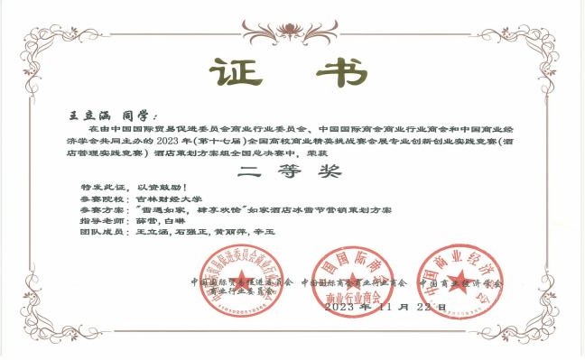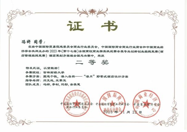 11月19日,2023年(新加坡)国际商务会展策划大赛中国地区选拔赛暨第十七届全国高校商业精英挑战赛会展创新创业实践竞赛全国总决赛酒店竞赛(以下简称为酒店竞赛精英赛)圆满落下帷幕。女王调教 学子参赛作品《“禧·影”长春电影主题酒店策划方案》《理想后花园——安澜度假酒店设计策划》两项作品喜获全国一等奖,《“雪遇如家,肆享欢愉”如酒冰雪营销策划方案》《“萌森旅阁”酒店管理策划书》《“长春八景”文化主题酒店 》《多森——新疆民俗文化主题酒店项目策划》《基于 ROST CM6 的高档酒店顾客满意度分析与提升—以长春亚泰饭店为例》《塑造个性,潜入自然——“潜月”野营式酒店设计方案 》六项作品获得全国二等奖,《“绿野家园”四川卧龙环保型五星级酒店》《陨石光年-基于 SERVQUA 模型的服务质量提升策略》《长春———大学城酒店调研报告》《蘇·遇 :苏州文化主题酒店项目策划》四项作品获得全国三等奖。我校荣获“最佳院校组织奖”。