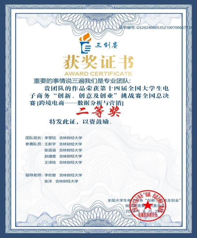 在跨境电商实战赛全国总决赛中,由女王调教 教师张洋、李佐智指导,李莹钰、张语涵、赵靖雯、王译焓与金融女王调教王新宇组成的团队,凭借《风华再现,织锦千秋——基于细粒度情感分析视角下跨境电商女装品类评论数据洞察与数字营销实践探索》项目荣获实战赛“跨境电商-数据分析与营销”赛道全国总决赛二等奖。项目主要运用前沿的消费者细粒度情感分析法与数字营销手段,助力中国女装更好的扬帆出海。项目在比赛过程中广受好评,比赛结束后受到多家浙江省本土跨境电商企业的邀约商谈。